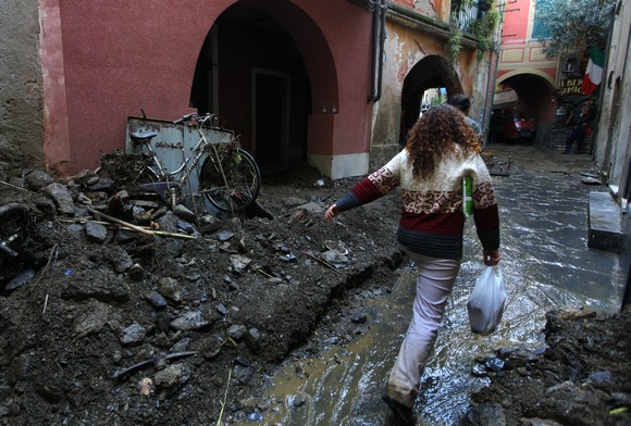 People walk in mud and debris in a street of Monterosso, one of the five villages that make up the Five Lands after overnight floods, on October 26, 2011 in the Spezia region. The areas worst hit by the floods in Italy were the Spezia region and the picturesque Five Lands tourist destination, where seven people — including a first aid worker — died. Two bodies were also recovered from northern Tuscany. AFP PHOTO / FABIO MUZZI (Photo credit should read FABIO MUZZI/AFP/Getty Images)