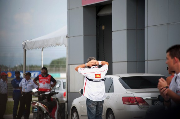 KUALA LUMPUR, MALAYSIA – OCTOBER 23: Paolo Simoncelli, father of Marco Simoncelli of Italy and San Carlo Honda Gresini, walks in front of Medical Center after the stop of the MotoGP race of MotoGP of Malaysia at Sepang Circuit on October 23, 2011 in Kuala Lumpur, Malaysia. (Photo by Mirco Lazzari gp/Getty Images)
