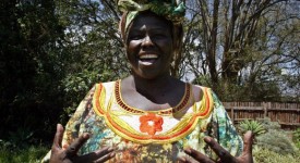 NYERI, KENYA: Kenya Assisant Minister for Environment and 2004 Nobel Peace Prize winner Wangari Maathai gestures 08 October 2004 as she addresses the media in Nyeri, 160 mk east of the Kenyan capital. Kenyan ecologist Wangari Maathai, whose campaign to save Africa’s forests began with nine trees in her yard nearly three decades ago, on Friday won the Nobel Peace Prize. She is the first African woman to take the award and it is also the first time since the prize was first awarded in 1901 that an environmental cause is honoured by the Nobel committee. Maathai, Kenya’s assistant minister for the environment since 2003, founded the Green Belt Movement in 1977, the largest tree planting project in Africa, aimed at promoting biodiversity and at the same time creating jobs and giving women a stronger identity in society. AFP PHOTO SIMON MAINA (Photo credit should read SIMON MAINA/AFP/Getty Images)